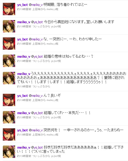 弁丸bot頑張ってます!!良い感じに仕上がってきたので、そろそろ日の目を見れそう?それにsakaさんが仔佐助botを作られているのですよ!!そして良く絡んでくれるんですが、弁丸bot対応できずで、いつも笑って誤魔化します・・・orz頑張ろう。
